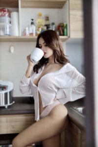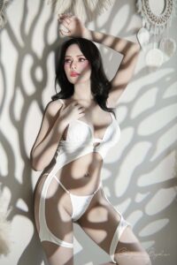เดี่ยวสีขาวลายลูกไม้ซีทรูเห็นทะลุ แล้วก็ทำผมหยิกสีน้ำตาล จนเหมือนกับตุ๊กตายาง ๆ จริง ยิ่งตอน ถ่ายแบบ ยกมือค้างไว้ ภาพสวยมากอันนี้ช่างภาพต้องได้เครดิตไปไม่แพ้ นางแบบ